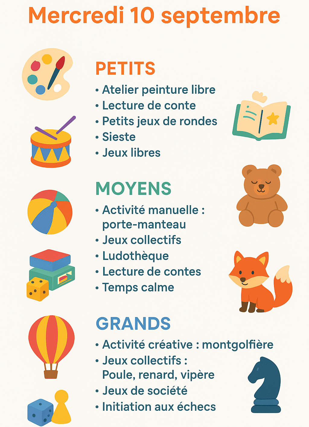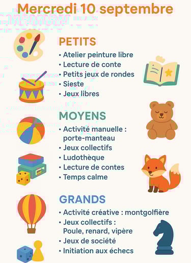 Une journée rythmée par des ateliers créatifs, des jeux collectifs et des temps calmes adaptés à chaque âge. Un programme varié pour s’amuser, apprendre et partager ensemble !