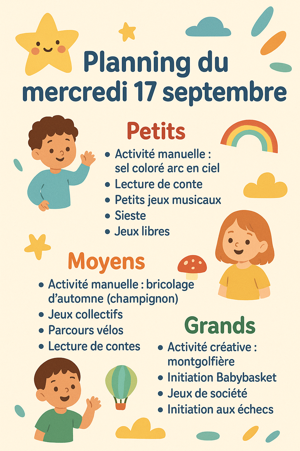 Une journée rythmée par des ateliers créatifs, des jeux collectifs et des temps calmes adaptés à chaque âge. Un programme varié pour s’amuser, apprendre et partager ensemble !
